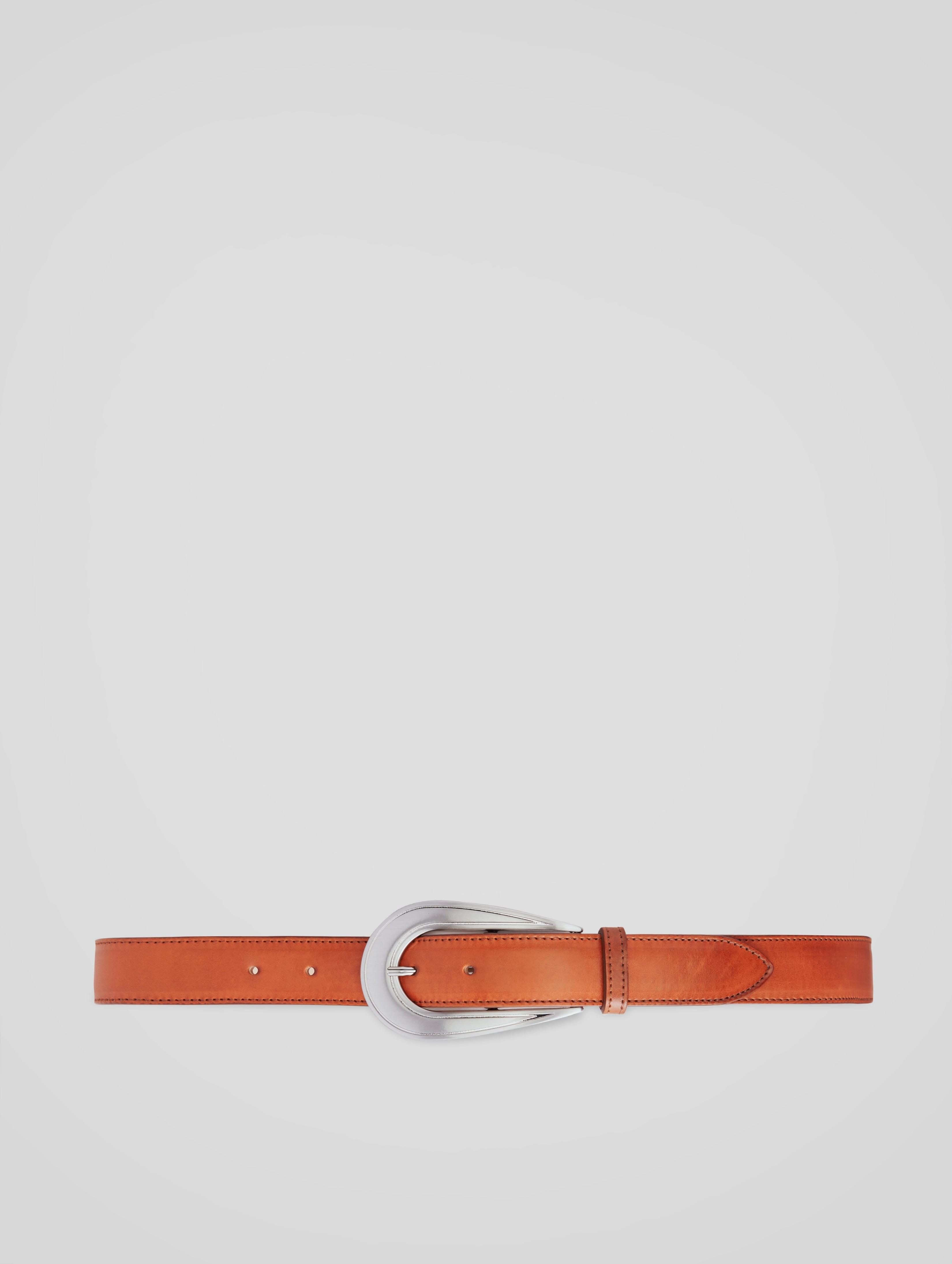 ICONIC!!! Western inspired with a modern attitude. This rock'n'roll belt features a luxurious satin silver finished buckle with an iconic long horseshoe shape. Handcrafted in Italy with a rich vegetable tanned, calfskin leather from Tuscany, this 3cm strap, looks as luxurious as you can get. Stand out from the crowd!