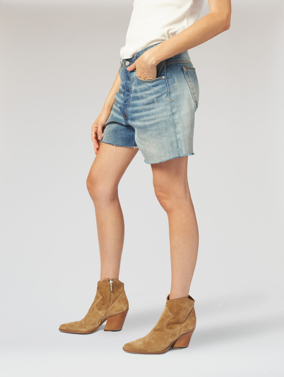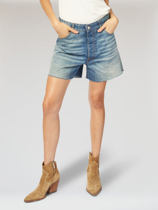 The IZZY DENIM SHORTS. A genderless high raise waist, comfortable yet stylish cut, vintage inspired silhouette with extreme wide legs. Made in Italy with a beautiful luxury Italian denim fabric, washed and distressed to perfection to bring this 70´s vintage look and finished with our 1978 silver buttons and leather tag in the back.